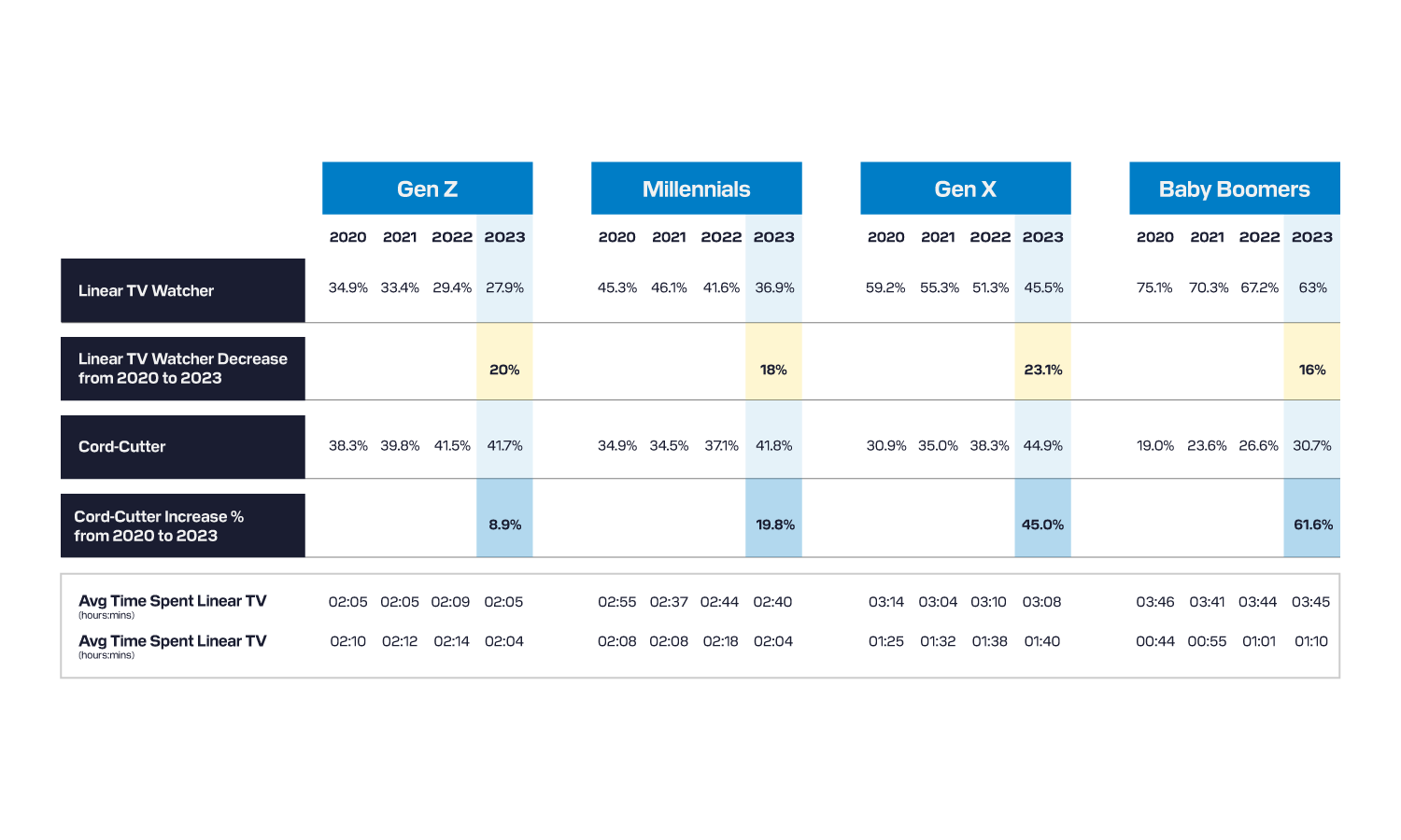 Data from GWI indicates that linear TV is more popular among baby boomers and Gen X, with only 37.1% of millennials and 27.9% of Gen Z indicating they watch linear TV. However, since 2020, 61% of baby boomers have become “cord-cutters” themselves.