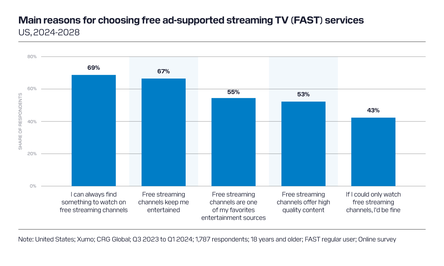 Survey data from Statista indicates that over half (53%) of FAST users indicate that free streaming channels offer high-quality content, and 69% stated they can always find something to watch.