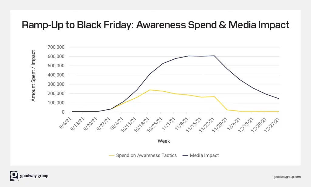 Many ecommerce companies take advantage of the holiday season to increase returns by boosting media budgets ahead of major holidays like Black Friday. Generating awareness, increase in reach and competition in the market are crucial considerations for holiday strategy planning. Awareness efforts, the main tactics used during the pre-holiday period, usually have a higher adstock effect than lower funnel tactics. In other words, the effect of awareness advertising is not often immediate on consumer purchase behavior. Optimizing revenue means finding the right timing for awareness tactics so the peak media impact occurs when consumers are most likely to purchase.