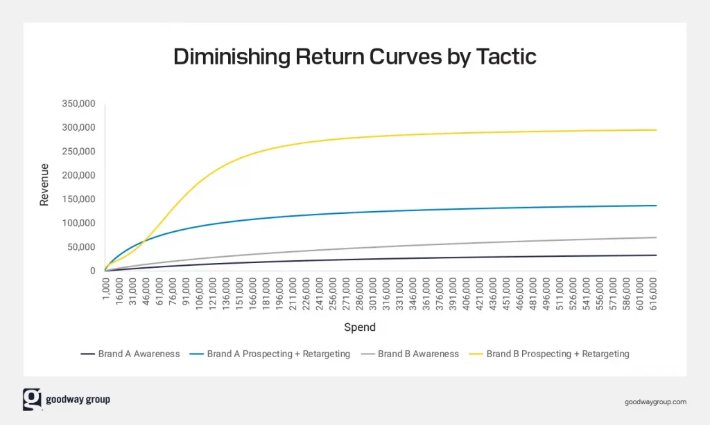 Figure 1: Diminishing return curves for two channels for two brands. For Brand A Prospecting + Retargeting, the point of diminishing returns is ~$300k spend per week. For Brand B Prospecting + Retargeting, the point of diminishing returns is at $100k spend per week. For awareness channels, the point of diminishing returns is lower for both brands.