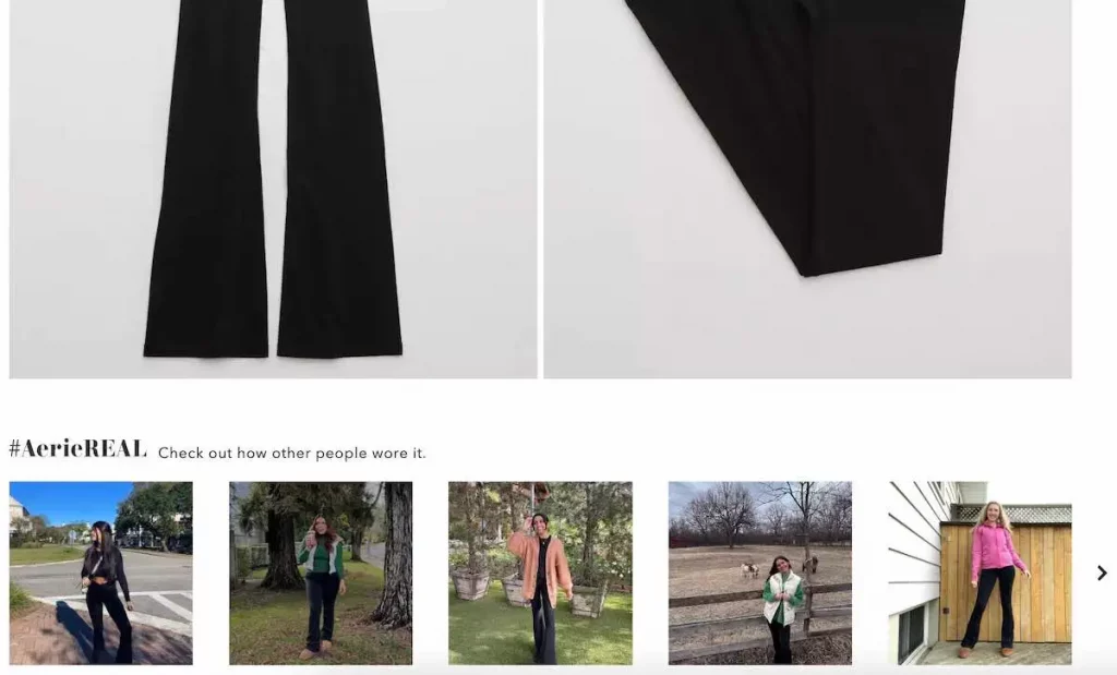 Showcasing user-generated content (UGC) on product pages boosts customer engagement and builds trust with potential buyers. For example, #AerieReal is Aerie’s UGC-led campaign. The retailer features real people wearing its products on each product page.